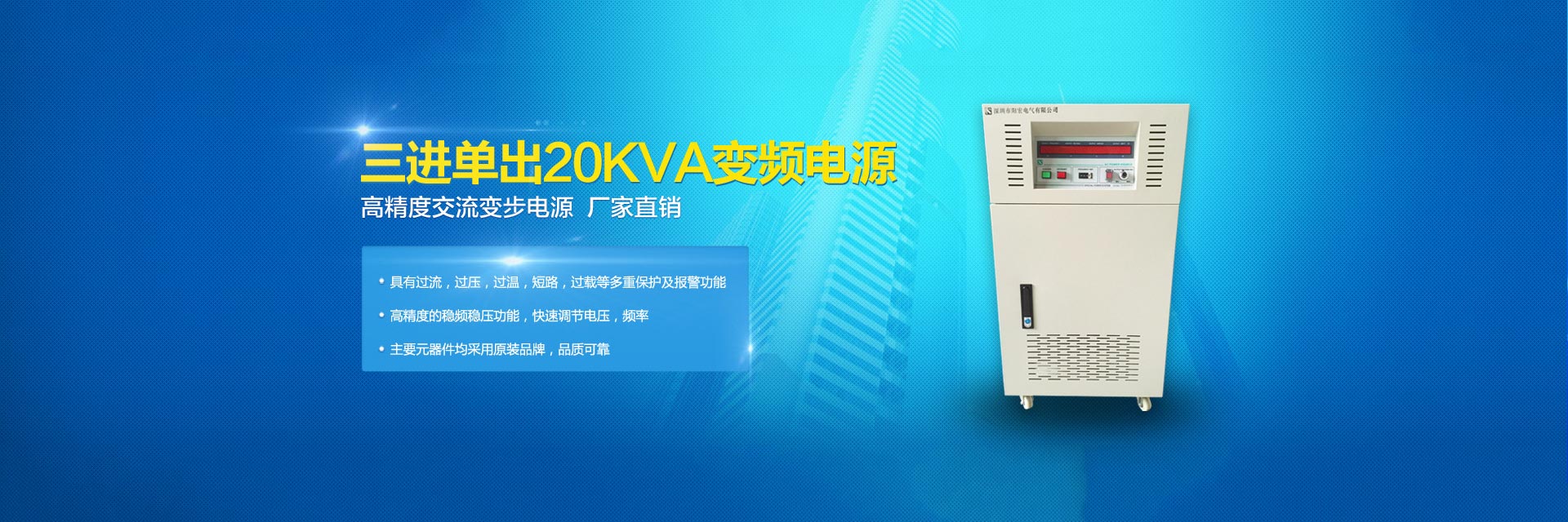 20年變頻電源制造品質(zhì)-陽(yáng)宏變頻電源為您提供5KVA變頻電源,10KVA變頻電源,20KVA變頻電源,30KVA變頻電源,45KVA變頻電源,60KVA變頻電源,75KVA變頻電源,深圳單相/三相/交流變頻電源等。 模擬式變頻電源,晶體管式變頻電源,可編程式變頻電源,單相大功率變頻電源,三相大功率變頻電源是陽(yáng)宏電源股份有限公司的核心產(chǎn)品。深圳市陽(yáng)宏電氣有限公司隸屬臺(tái)灣陽(yáng)宏電源股份有限公司,是一家變頻電源開(kāi)發(fā)、研制、生產(chǎn)、銷(xiāo)售和服務(wù)的高新技術(shù)企業(yè)。其大陸工廠:深圳市陽(yáng)宏電氣有限公司,是臺(tái)灣陽(yáng)宏電源股份有限公司在中國(guó)大陸一家分公司,地址:深圳市寶安區(qū)觀瀾街道觀瀾高新科技園區(qū)。 臺(tái)灣陽(yáng)宏電源股份有限公司創(chuàng)建于1995年,目前除了臺(tái)北公司以外,在中國(guó)的廣東深圳設(shè)有分公司,工廠擁有許多的先進(jìn)設(shè)備。具有年產(chǎn)各種電子儀器電源設(shè)備20000臺(tái)以上,工廠有嚴(yán)格的生產(chǎn)能力,強(qiáng)大的開(kāi)發(fā)技術(shù)的管理制度,可以接受新高技術(shù)產(chǎn)品的開(kāi)發(fā)與研制。